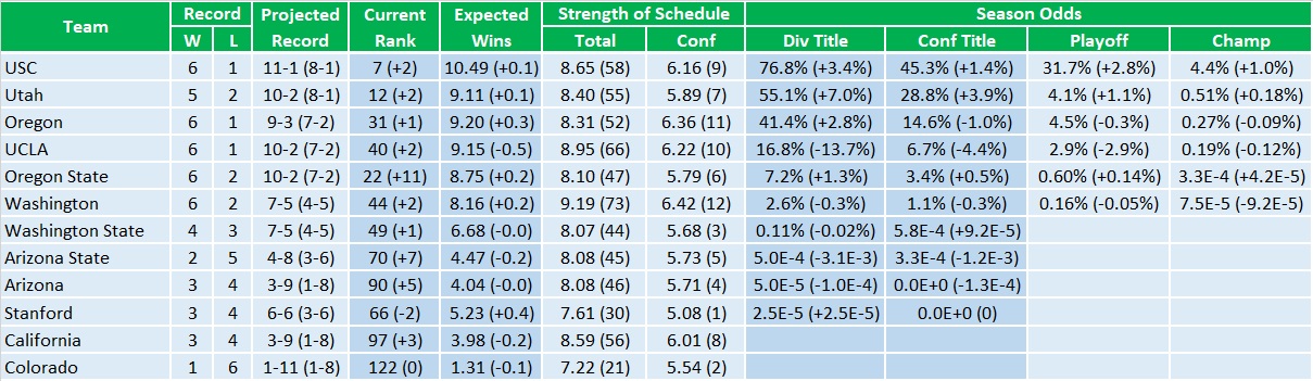 Out west in Pac-12 action, USC (77 percent) and Utah (55 percent) have the best odds to advance to the Pac-12 Championship Game, but both teams had a bye in Week Eight. Oregon (41 percent) beat UCLA (17 percent) in the only significant conference action. With the win by the Ducks, the Pac-12 is trending towards a three-team race for the top two spots.